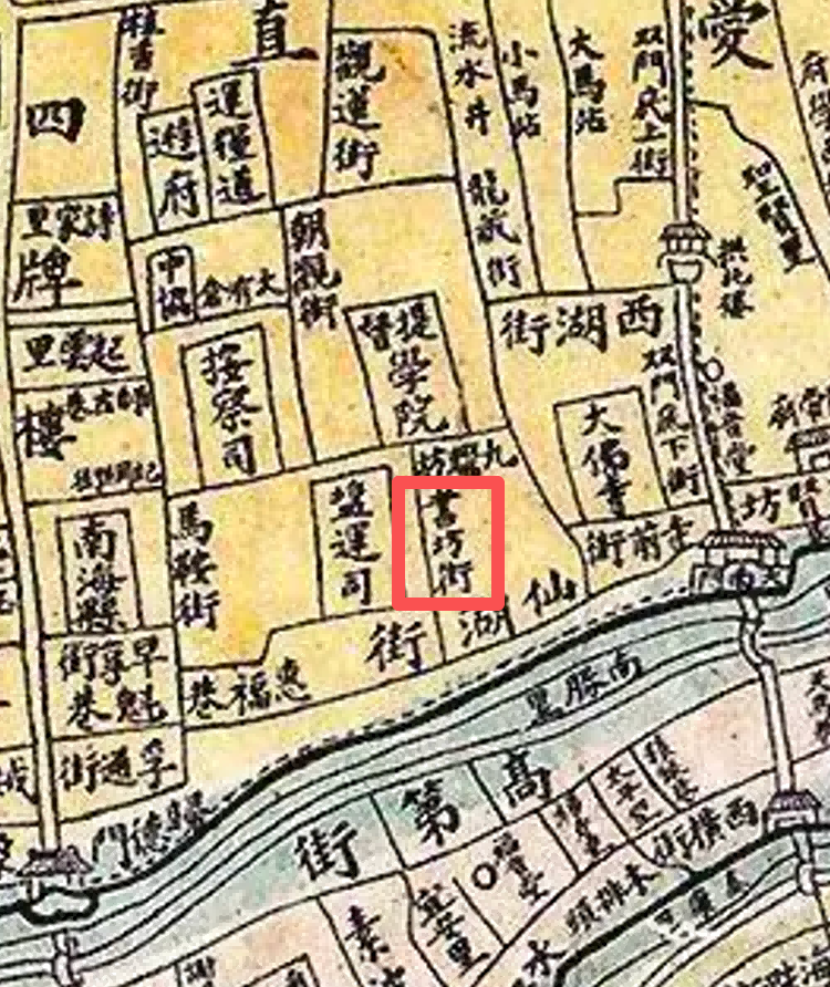 当时书坊街有牌楼,石匾上刻有“书芳街”三字,后牌楼毁去,刻有“书芳街”三字的条石曾经铺在书坊街南端的地面上。后来,提督学院不复存在,“书坊街”逐渐成为正式的街名。